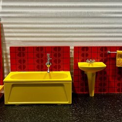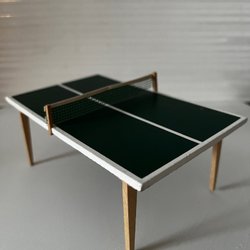 En charmig miniatyr-TV med retrodesign. Den har en brun träfinish och röda ben. Dockskåpsmöbel i Lundbystorlek skulle jag säga.