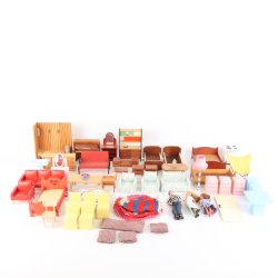 Olika slags dockmöbler /leksaksmöbler i miniatyr. Innehåller bland annat några stolar och bord i allmogestil. Här finns även en byrå, en stol i metall och ett piano. Perfekt för barnens lek och dockskåp. Det är välanvänt men charmigt!