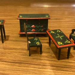 Diverse möbler till dockskåp. Här finns en cool sänggavel, sängar, bord, stolar, skåp, spis, diskho, tvättmaskin och TV. I använt charmigt skick.