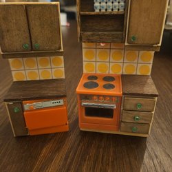 Ett dockskåpskök i orange och gult. Köket består av vask, spis, kylskåp och 2 bänkar med lådor. Bra skick men finns ett litet märke på kylskåpsdörr, samt avskav i hörn på ena bänken.