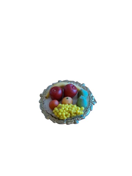 Dekorativ fruktskål med olika frukter. Till dockskåp eller tittskåp. Diameter 3,5 cm.