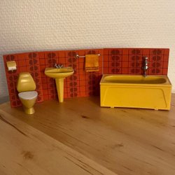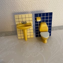 Lundby badrumsmöbler med badkar och toaletter. Perfekt för dockskåpet. De gula toa och badkar är i mycket bra skick. Två äldre toastolar (beige färg) är defekta.