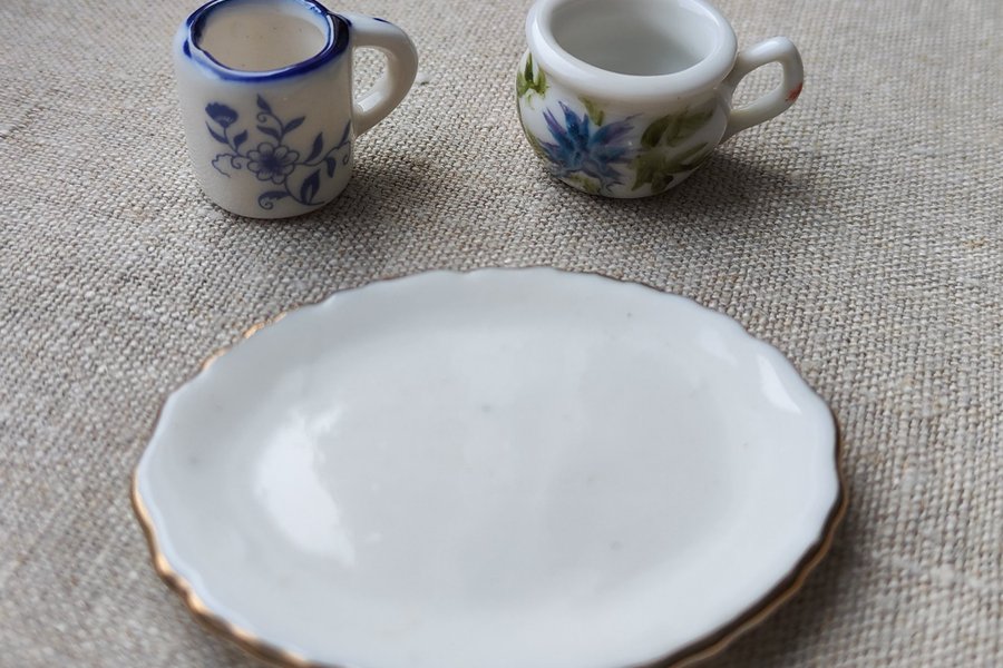 Ett serveringsfat ovalt 4,5x6 cm, en potta med handmålat mönster H 2 cm, B 3 cm. En mugg med blommönster H 2 cm, B 2,5 cm.