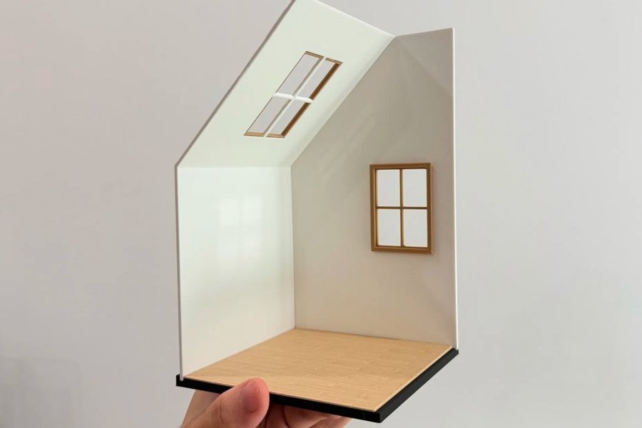 Ett rum för dockhus. Perfekt för att skapa en mysig och realistisk miljö för dina dockor. Inkluderar ett fönster på väggen och ett takfönster. Ett stilrent bord med tillhörande stolar. Perfekt för mindre utrymmen eller som en del av en större möbelgrupp. Allt kommer i vit färg storlek 1:12 kan behöva limas ihop