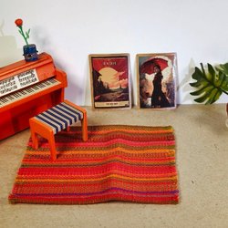 Miniatyr skrivbordsset i trä med en stol, en skrivbordslampa och en jordglob på ett litet bord. Skrivbordet har flera lådor och en grön skrivyta. Stolen har en röd sammetsdyna. Lampan är blå och guldfärgad (ingen lysfunktion).