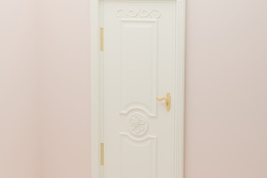 En vit innerdörr. Dörren har en klassisk design med speglar och ett handtag.