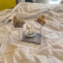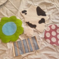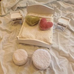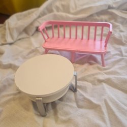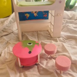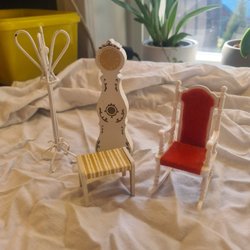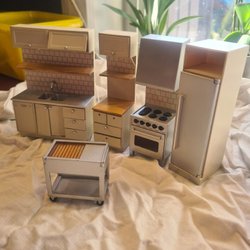 Detta set med dockskåpsmöbler för badrummet innehåller ett skötbord med gröna lådor, ett handfat med dubbla kranar och spegel, en toalett med toalettborste och en tvättmaskin. Möblerna är designade för att passa i ett dockskåp och erbjuder detaljerade tillbehör för lek.