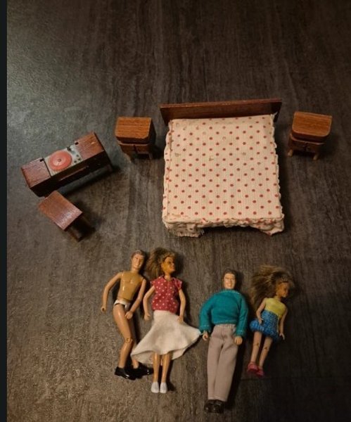 Detta set innehåller dockskåpsmöbler och dockor. Möblerna inkluderar en säng med sängkläder, två sängbord, ett skåp och en pall. Det finns fyra dockor i olika kläder.