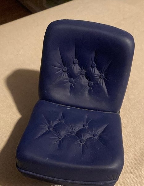 Dockmöbel i form av en blå stol. Stolen har en tuftad design på både ryggstöd och sits. Tillhör Sindy Barbie collection.