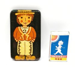 Dockskåpsmöbler av papper. Bokhyllan monterad på tändsticksaskar. Kökssektionens mått anpassat efter tändsticksaskars mått. Skala ungefär som Lundby, ev något mindre. Enligt förra ägaren kom möblerna i en tidning på 1970-talet och man fick själv klippa ut och montera askarna. Jag tycker att de är supercoola och gissar att inte så många har överlevt ända sen 70-talet. Bokhyllan är 16 cm bred, 10.8 cm hög och 1.5 cm djup. Köksdelen är 16 cm bred, 4.3 cm hög och 4 cm djup. Skicket är ok med tanke på ålder och material.