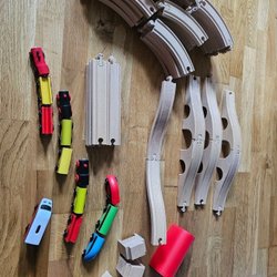 Ett set med tågbana i trä. Innehåller räls, broar, tåg, bilar och byggnader. Det mesta i från Biltema. Några tåg i från Brio + ett gammeldax tåg.