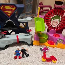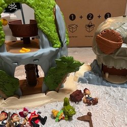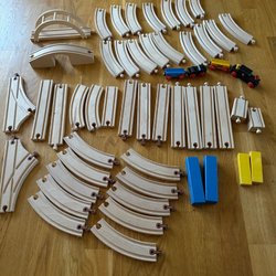 Stor samling av tågbana i trä. Inkluderar räls, broar, tåg, fordon, träd, skyltar och andra tillbehör. Tror det är 3 olika set, men alla passar ihop. Säljer av mina barns gamla leksaker.