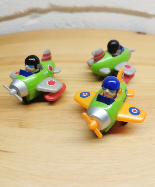 Tre roliga leksaksflygplan i olika färger. Perfekt för barnens lek och fantasi. Dra den bakåt- släp -, den går framåt i hög fart