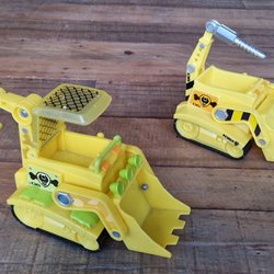 Tre paw patrol fordon. Inkluderar en gul grävmaskin, en blå polisbil och en röd bärgningsbil.