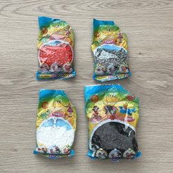 Ett set med pärlplattor i olika former och flera påsar med rörpärlor i olika färger.