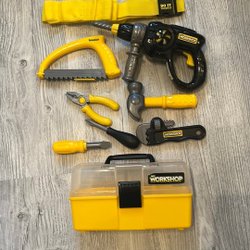 Ett set med leksaksverktyg för barn. Inkluderar en leksakskedjesåg från Bosch och verktyg från Black & Decker, som borr, slipmaskin, såg, tång och måttband.