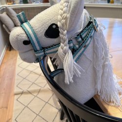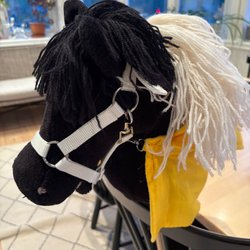 Käpphäst med vitt huvud och vit man. Käpphästen har svarta ögon och en vit pinne.