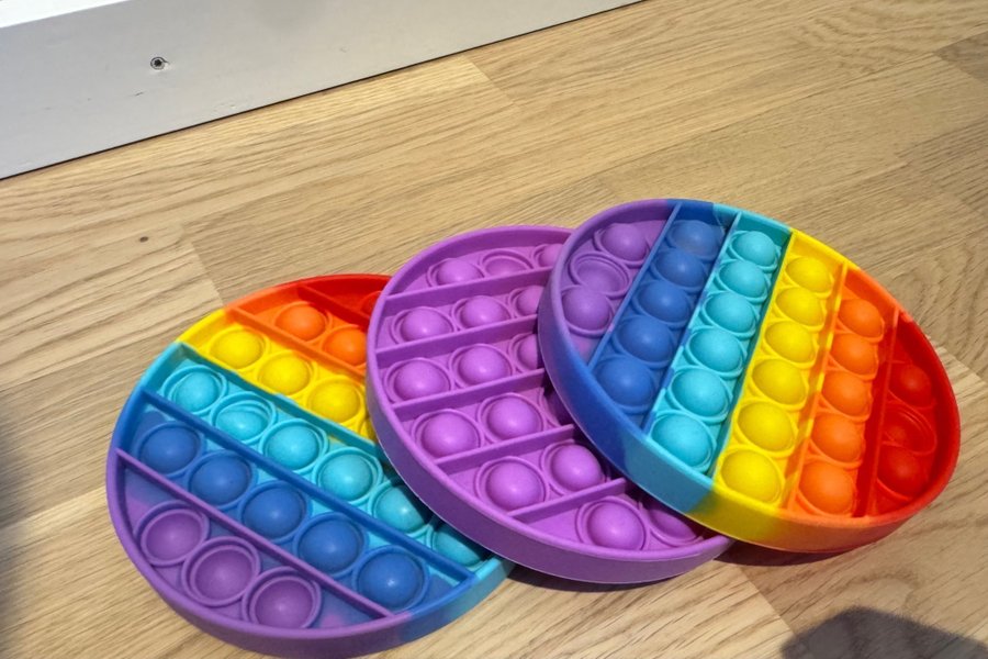 Tre runda Pop It leksaker i olika färger. Perfekt för barn. Typ oanvända