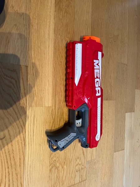 Nerf Mega Blaster i rött och grått. Leksaksvapen för barn.