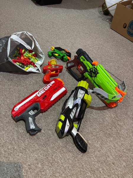 Ett parti med Nerf blasters och en påse med pilar. Innehåller en Nerf Mega Magnus, en Nerf Zombie Strike Crossbow, en Nerf Zip-Shot och en X-Power Blaster 350.