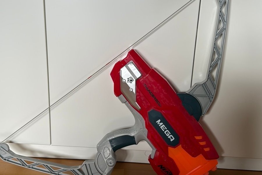 Nerf N-Strike Mega Thunderbow är en leksaksbåge som skjuter pilar. Den har en röd och grå design med ”MEGA” och ”THUNDERBOW” tryckt på sidan. Bågen är utformad för att skjuta Nerf Mega-pilar.