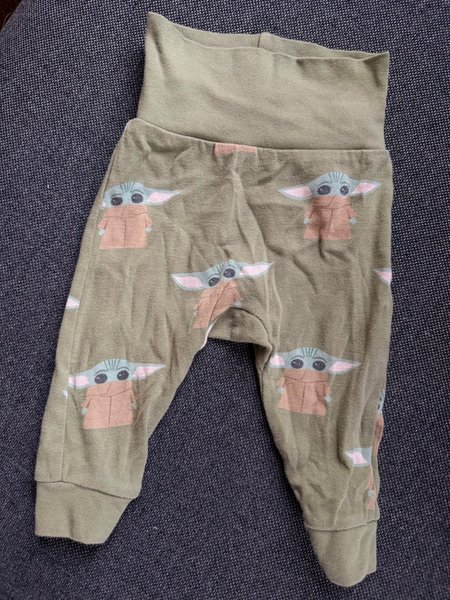 Byxor med resår i midjan och muddar vid bensluten. Byxorna har ett mönster av Grogu, även känd som Baby Yoda, från Star Wars-serien The Mandalorian.