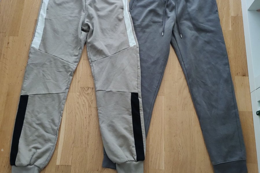 Två par mjukisbyxor strl 170. Det ena paret är beigefärgat med vita och svarta detaljer och är helt nya! Det andra paret är enfärgat grått och använa lite.