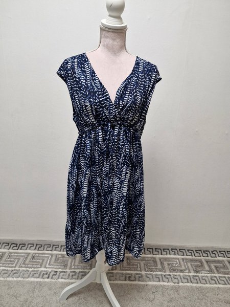 Mönstret är i blått och vitt, vilket ger ett livfullt intryck. Klänningen har korta ärmar och en lös passform nedtill.