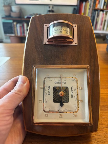 En klassisk väderstation med barometer och termometer. Den visar aktuellt lufttryck och temperatur.