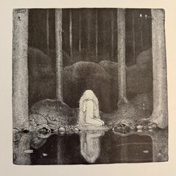 «Inge vid den mörka sjön” av John Bauer, publicerad 1918 av Hasse W. Tulllbergs Boktryckeri. Tryckpapperet är 34 x 29cm. Motivmått ca 18 x 18cm.