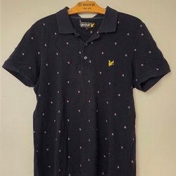 Marinblå t-shirt från Lyle & Scott med ett diskret prickigt mönster. T-shirten har en rund halsringning och en broderad logotyp på bröstet.