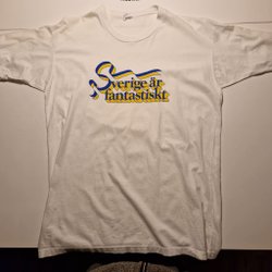 Vit t-shirt med orange kantband runt halsen och ärmarna. Tryck framtill med texten "Wonderful Copenhagen" OBS! kolla motivet ordentligt innan du bestämmer dig för köp. Liten storlek