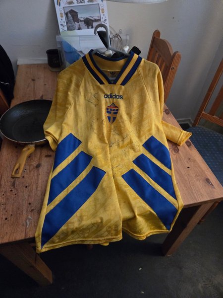 Sverige landslagströja från Adidas med det svenska fotbollsförbundets emblem. Tröjan är gul med blå detaljer och har autografer från laget som tog VM-brons 1994 i USA.