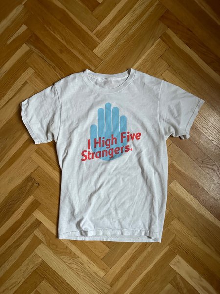 Vit t-shirt med ett tryck av en ljusblå hand och texten "I High Five Strangers." i rött. T-shirten har korta ärmar och en rund halsringning.