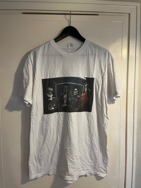 Vit t-shirt med ett tryck av fyra skelettliknande figurer.
