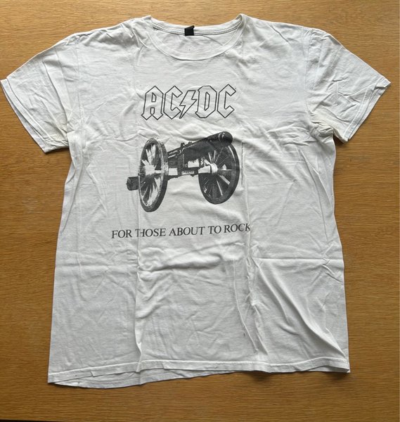 Vit t-shirt med tryck av AC/DC-logotypen och en kanon med texten ”FOR THOSE ABOUT TO ROCK” undertill. Tröjan har korta ärmar och en rund halsringning.