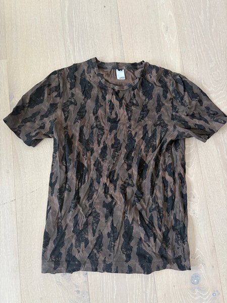 T-shirt med kort ärm och rund halsringning. Mönstret är abstrakt i mörkbruna och svarta toner.