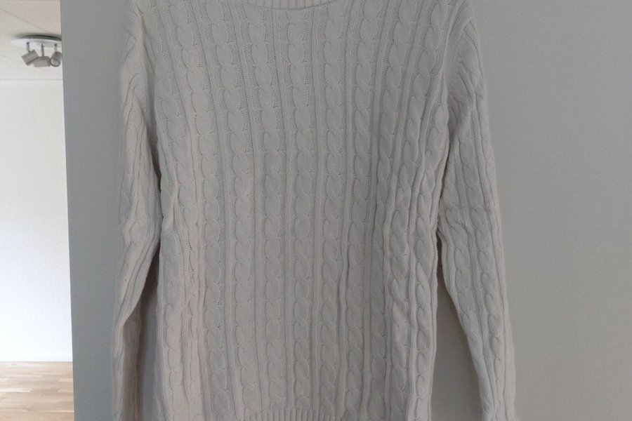 En vit tröja med flätstickat mönster över hela plagget. Tröjan har långa ärmar och en rund halsringning med ribbstickad mudd. Ärmsluten och nederkanten är också ribbstickade.