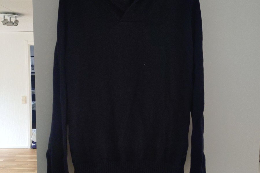 En mörkblå tröja med en krage i sjalkrage-stil. Tröjan har långa ärmar och en ribbad mudd i nederkant och vid ärmsluten. Halsringningen är V-formad.