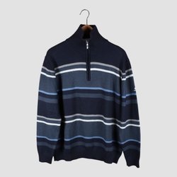 Marinblå italiensk halvzip i mjuk ullblandning. Flätstickat mönster framtill och ståkrage med kontrastfärg invändigt. En tidlös modell med maritim känsla – perfekt för vardag och fritid.