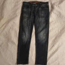 Blå stickad tröja med långa ärmar och vita ränder nedtill. Har dessvärre krympt så jag skulle föreslå till dom som har medium.