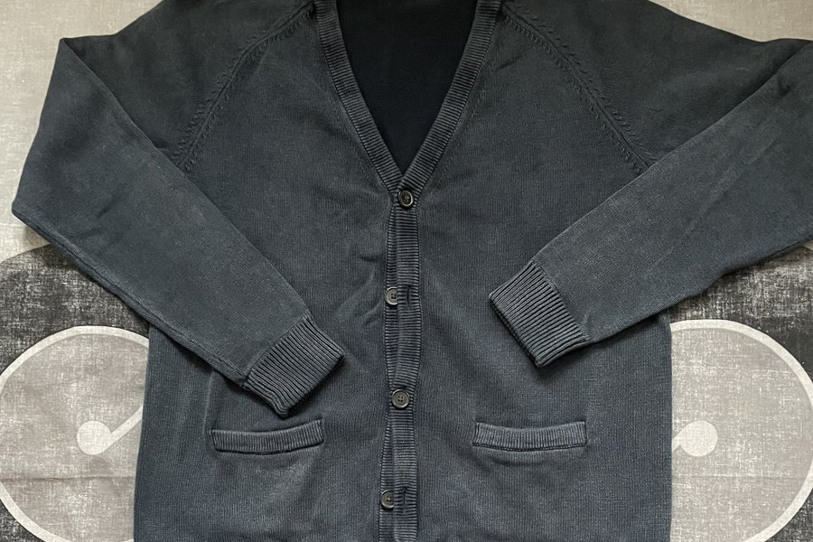 Mörkt blågrå, v-ringad, helknäppt bomullskofta med fickor