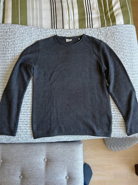 En mörkgrå långärmad tröja med rund halsringning. Tröjan har en finstickad textur över hela plagget. Muddarna vid ärmslut och nederkant är diskreta och smälter väl in i designen.