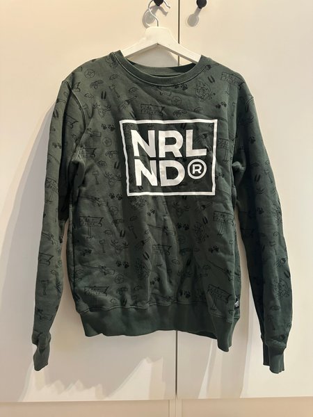 Grön tröja med tryck av olika jaktmotiv och texten ”NRL ND®” i en vit rektangel på bröstet.