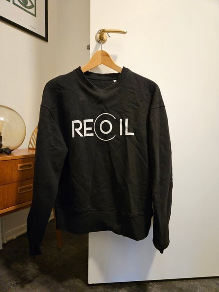 Svart sweatshirt med långa ärmar och ribbade muddar. Tröjan har ett vitt tryck med texten "RECOIL" på framsidan.