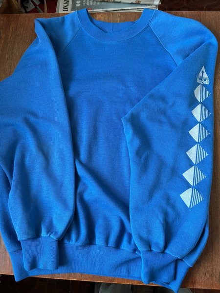 Skön Blå sweatshirt med rund halsringning och långa ärmar. Tröjan har muddar i ärmslut och nederkant. På vänster ärm finns ett tryck med geometriska former och texten "BinSell".