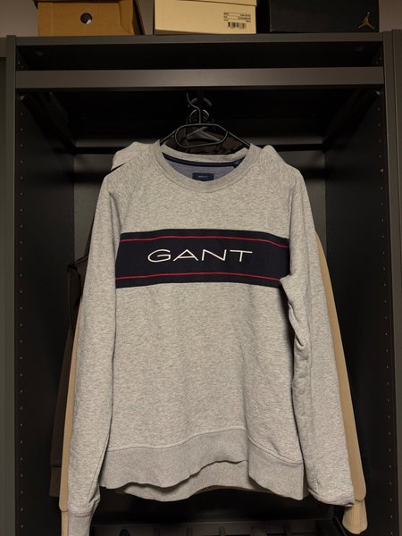 Tröja med långa ärmar och rund halsringning. Tröjan har en bred horisontell rand över bröstet med texten "GANT" i vitt. Ränderna är kantade med tunna röda linjer.