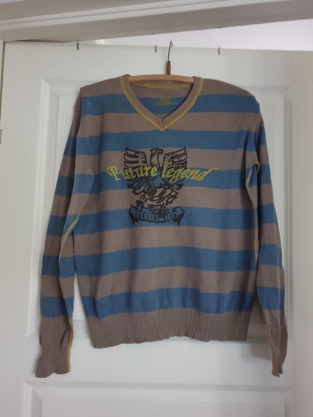 Tröja med ett randigt mönster i blått och beige. Den har en V-ringning med guldfärgade detaljer och ett tryck med texten "Future Legend" och en örn på bröstet.