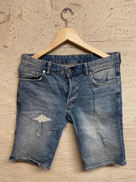 Ett par blåa jeansshorts med slitna detaljer. Shortsen har knappgylf och fem fickor, varav en liten myntficka framtill. De har bälteshällor runt midjan.