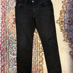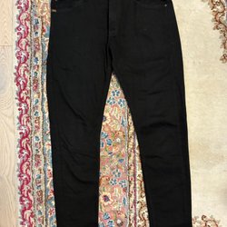 Ett par vinröda byxor med fickor fram och bak. Byxorna har en knapp och dragkedja.